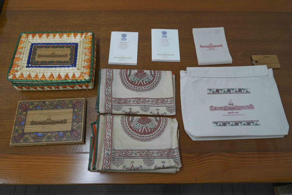 The ensemble includes a finely woven Sikki grass box from Bihar, handcrafted by rural women artisans using golden-hued grass; a bamboo photo frame from Jharkhand designed as a symbolic gateway with vibrant Madhubani art; a hand block-printed tussar silk stole with fish, lotus, and spring motifs in a tricolour palette; and a curated selection of folk paintings including Bihar’s bold Tikuli art, Jharkhand’s ancient Patkar scrolls, Odisha’s intricately engraved Tala Pattachitra, and West Bengal’s dynamic Bengal Pattachitra storytelling scrolls.
