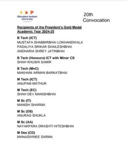 Dhirubhai Ambani University (DAU), formerly DA-IICT, held its 20th Convocation Ceremony on Saturday at its Gandhinagar campus, awarding degrees to 649 students across undergraduate, postgraduate, and doctoral programmes. Prof. Bhaskar Ramamurthi, Professor Emeritus, Department of Electrical Engineering, and former Director of IIT Madras, was the Chief Guest and delivered the Convocation Address.