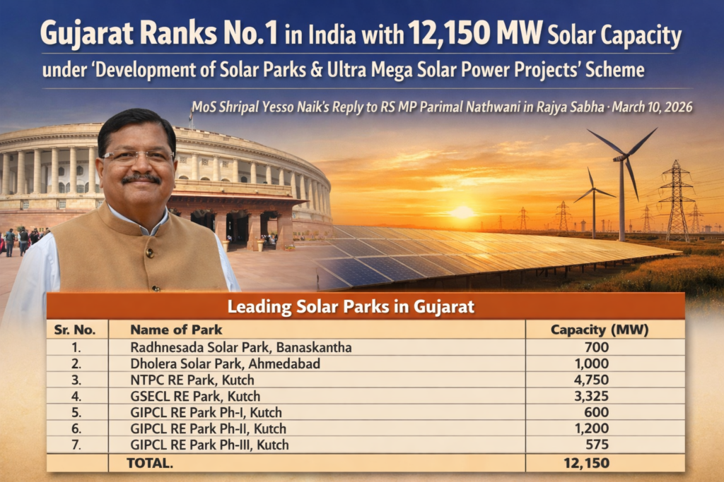 March 10, 2026: The Government of India has sanctioned 54 Solar Parks sanctioned under the scheme for “Development of Solar Parks and Ultra-Mega Solar Power Projects” as on 28 February, 2026. Out of these, 7 Solar Parks are in Gujarat. The state ranks No. 1 with 12,150 MW of sanctioned power generation capacities under this scheme. The information was provided by Union Minister of State for New & Renewable Energy Shri Shripal Yesso Naik in Rajya Sabha on March 10, 2026, while replying to a question raised by RS MP Parimal Nathwani.