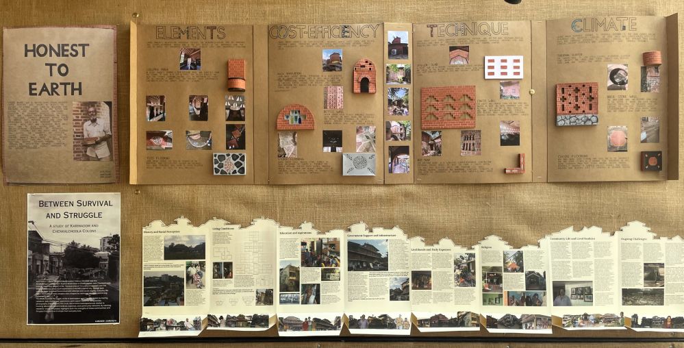 The projects cover a wide spectrum of themes—from documenting a “pen hospital” in Thrissur to exploring the ecological and cultural significance of Kaavu temples (sacred groves). Other works analyse passive cooling techniques in heritage buildings like the Napier Museum and Kuthira Malika Palace, while some interpret political expression through installations mapping street-side sloganeering in Thiruvananthapuram.